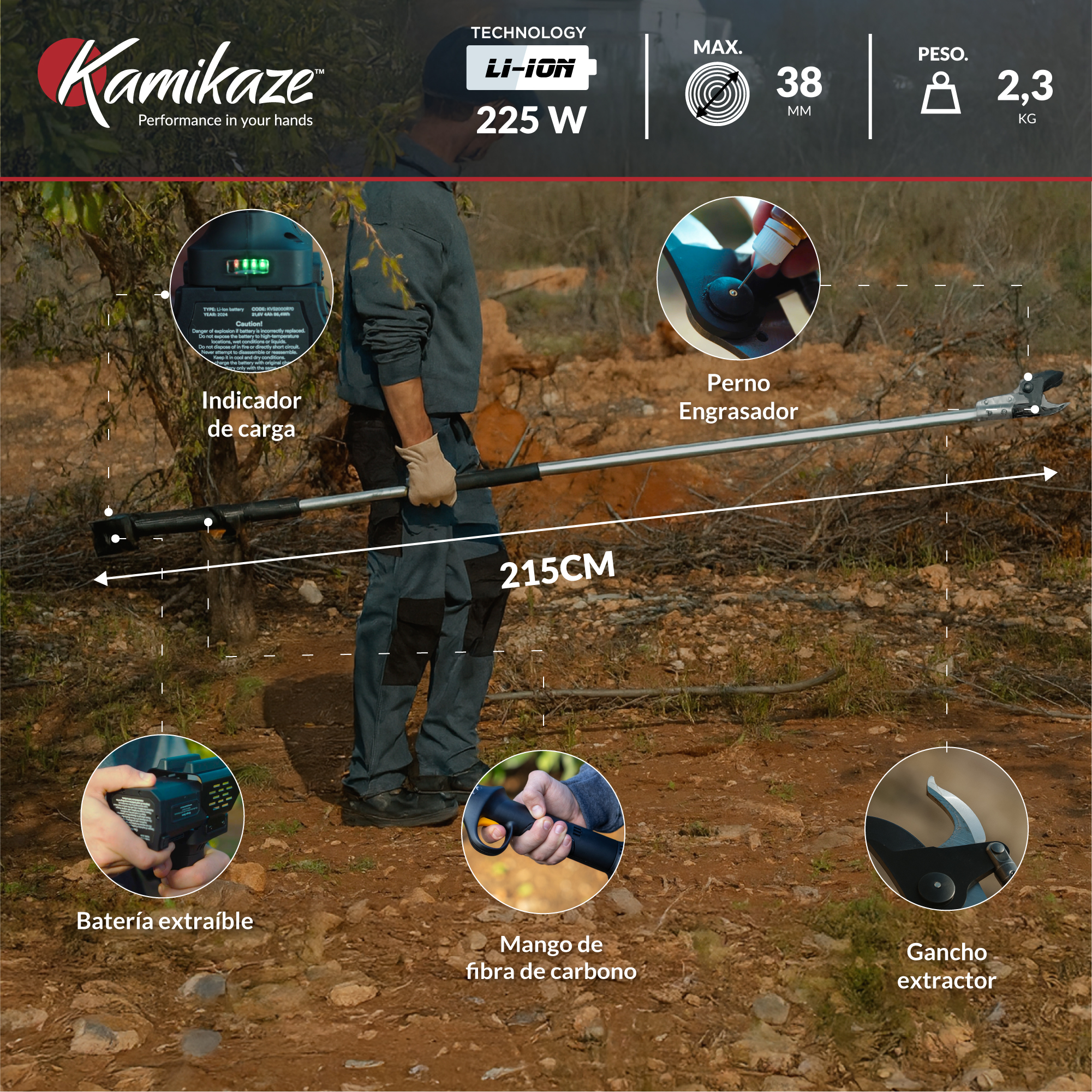 Potente y precisa: Equipado con un motor de 195 W, esta pértiga ofrece un corte máximo de Ø 38 mm, asegurando un rendimiento eficiente y preciso en cada uso.